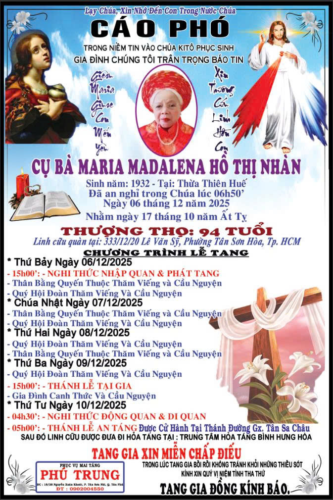 Trong Niềm tin vào Chúa Kitô Phục Sinh. Giáo Khu VI, xin được báo tin Cụ Bà Maria-Madalena Hồ Thị Nhàn, đã an nghỉ trong Chúa.