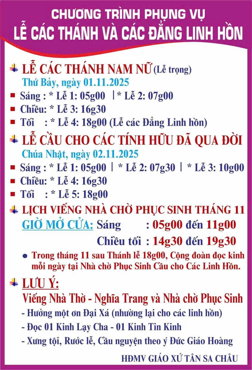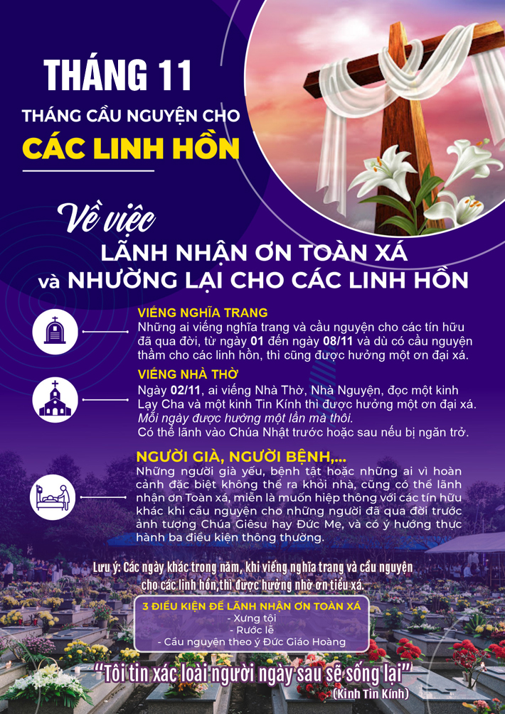 Tháng mười một vẫn được dành riêng cho các linh hồn. Người Công Giáo nói chung rất quan tâm đến những ai đã ra đi, mong rằng người thân quá cố của mình được chia sẻ hạnh phúc với Thiên Chúa tình yêu. Đây là một ước muốn rất đẹp, rất tình người.